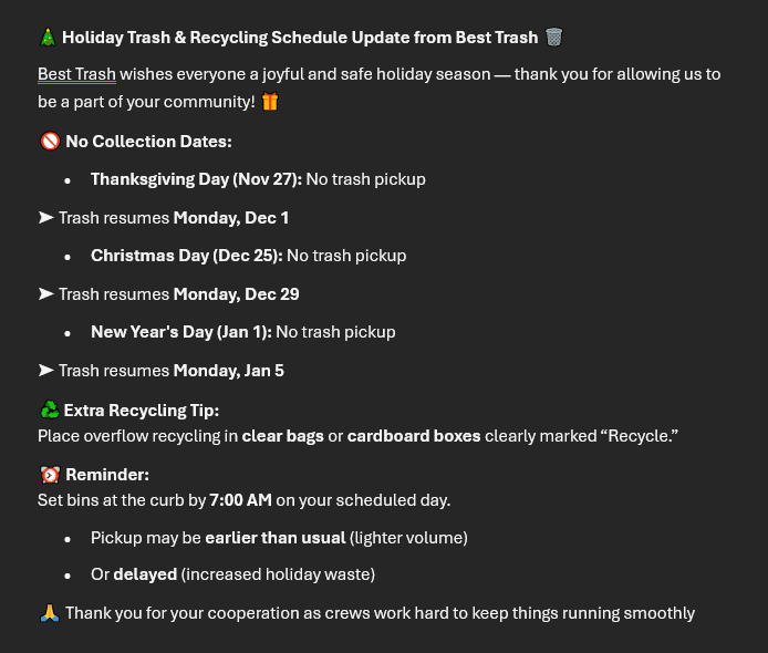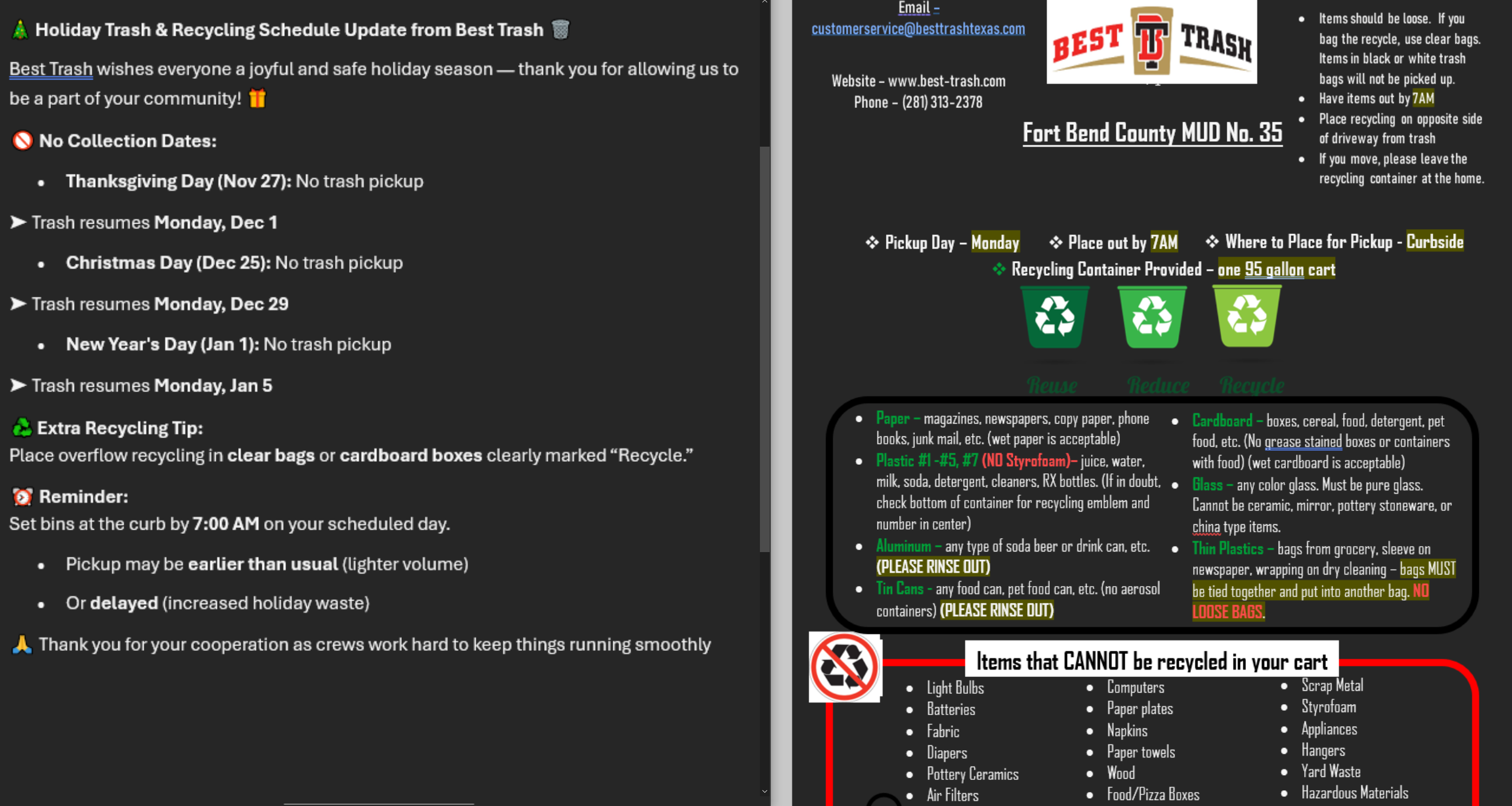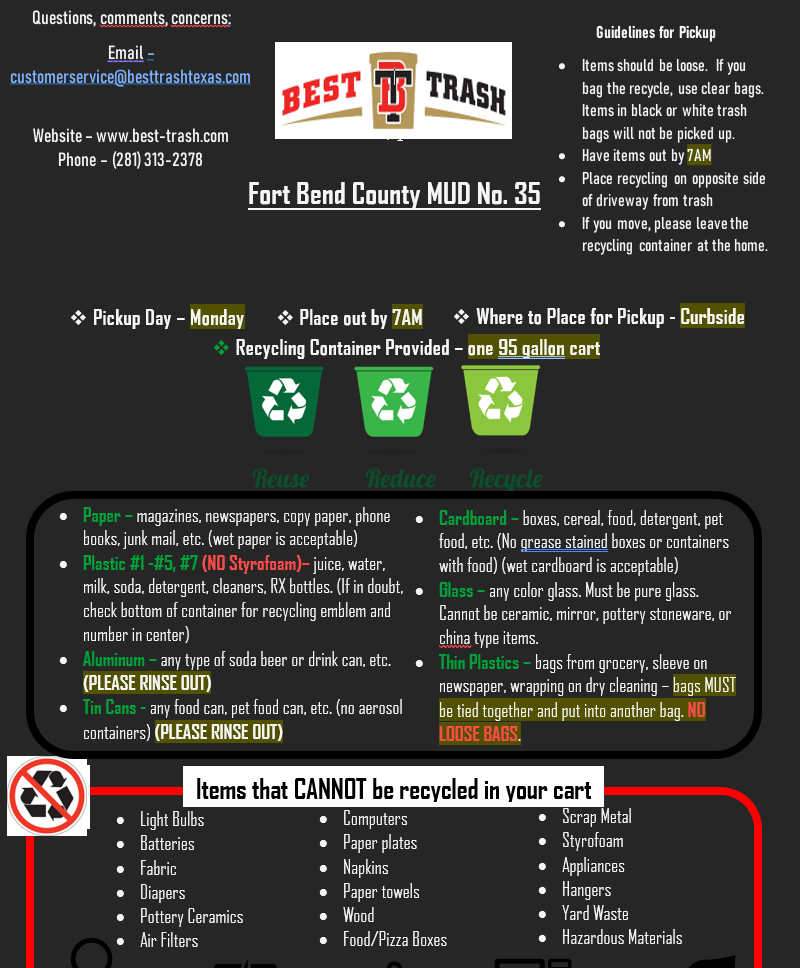 Residents can contact Best Trash Customer Service by email, customerservice@besttrashtexas.com, in the event garbage is not picked up on scheduled pick up days.